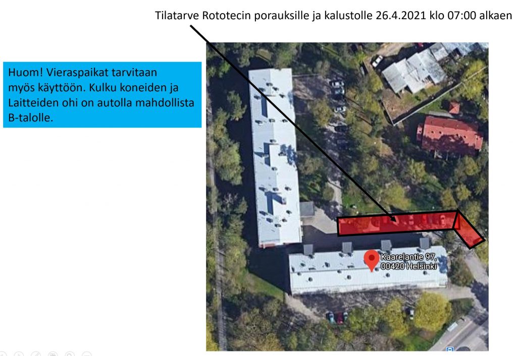 A-talon sisäpihan puoleinen parkkipaikka ja vieraspaikat on pois käytöstä 26.4. klo 7:00 alkaen maalämpökaivojen porausten takia. Parkkitilaa löytyy esimerkiksi Kaarelantie ja Tanotorventien varresta. Kulku koneiden ja laitteiden ohi autolla B-talolle on mahdollista. Poraukset sisäpihalla saadaan valmiiksi arviolta 7.5.